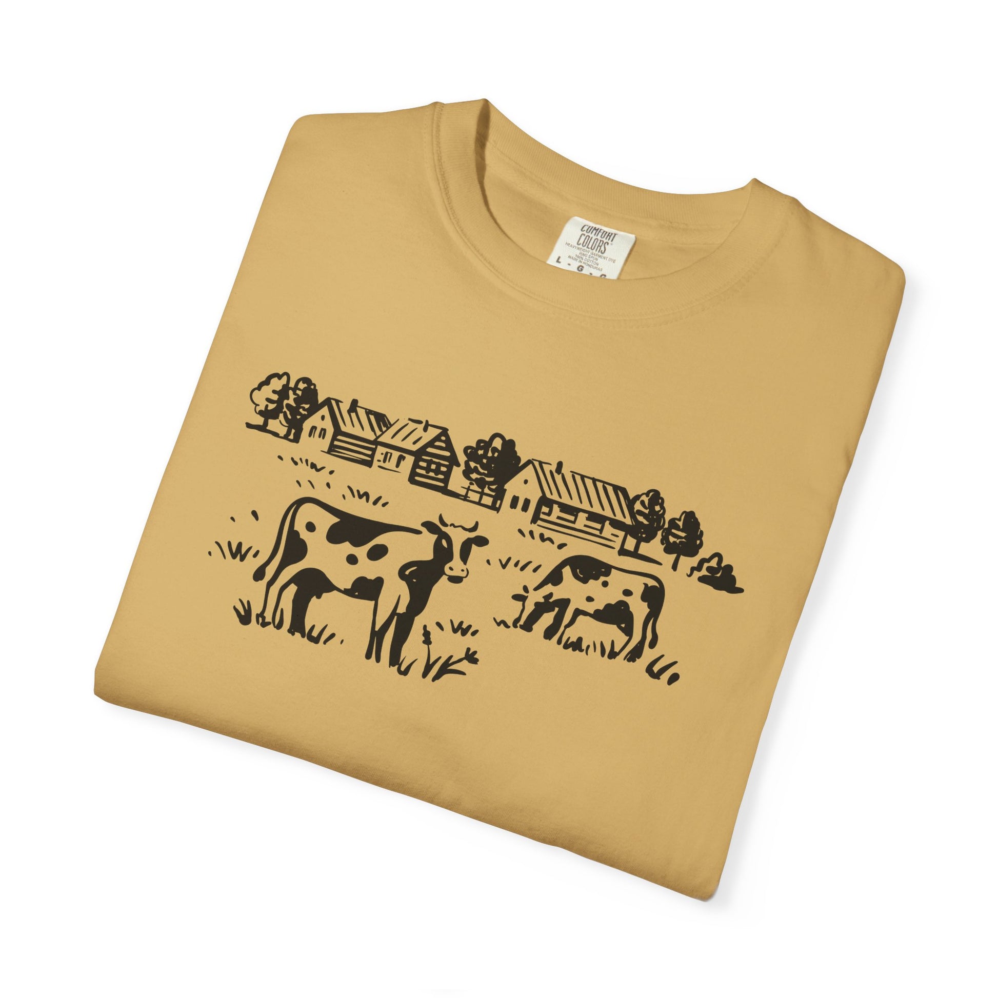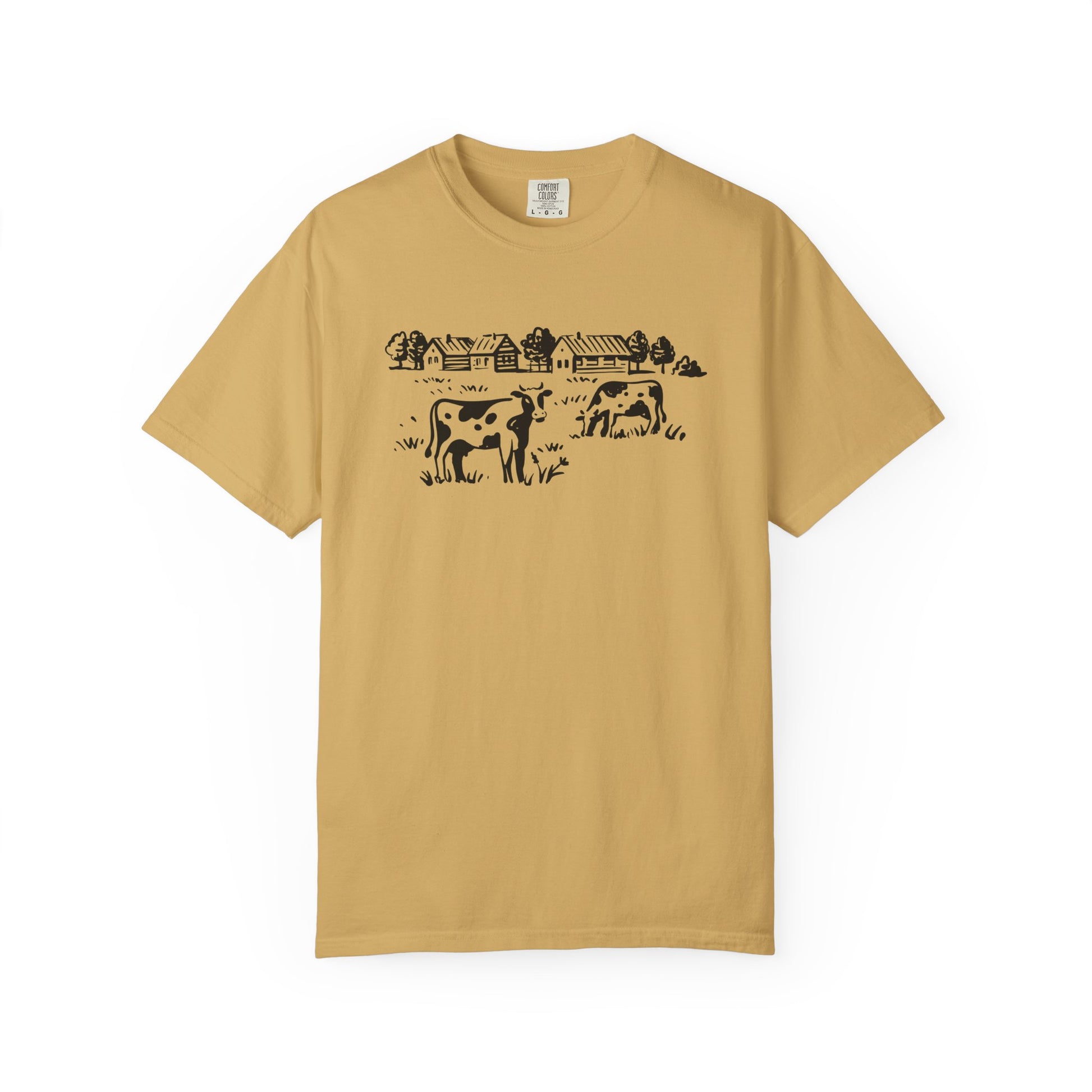 This soft, garment-dyed tee carries a quiet slice of country life. A hand-drawn pasture scene—cows grazing with a line of barns and trees behind them—sits across the chest in a simple, rustic ink-style print. The heavyweight cotton and relaxed fit feel lived-in from the first wear; the dye-after-construction finish gives each shirt a muted, slightly vintage tone that works with denim, workwear jackets, or a layered flannel. Wear it on cool mornings at the farmer’s market, while tending to chores at the homestead, or tucked into a weekend at the cabin. The sewn-in label and clean tubular knit keep the silhouette simple and comfortable, so the artwork stays the quiet focal point of the outfit.