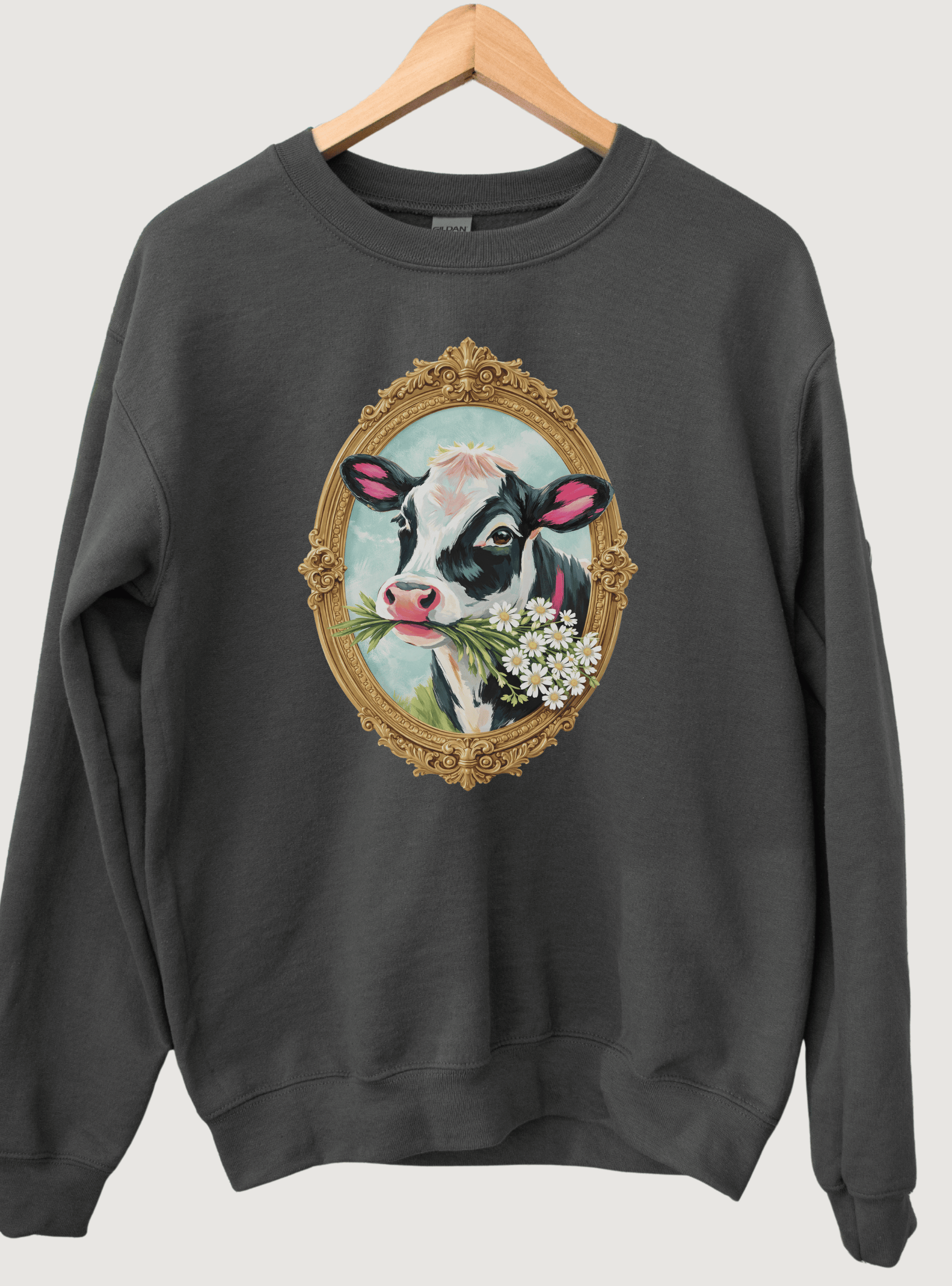 Soft, roomy, and quietly charming — this crewneck brings a touch of farmhouse whimsy to everyday comfort. A hand-painted cow portrait sits in a gilded oval frame on a muted charcoal sweatshirt, like a small piece of country art you can wear. The midweight fabric drapes easily for layering, while reinforced stitching and a resilient ribbed collar keep the silhouette looking clean after many wears. Slip it on for slow mornings with coffee, evening chores in the barn, or city walks when you want a cozy nod to pastoral life.