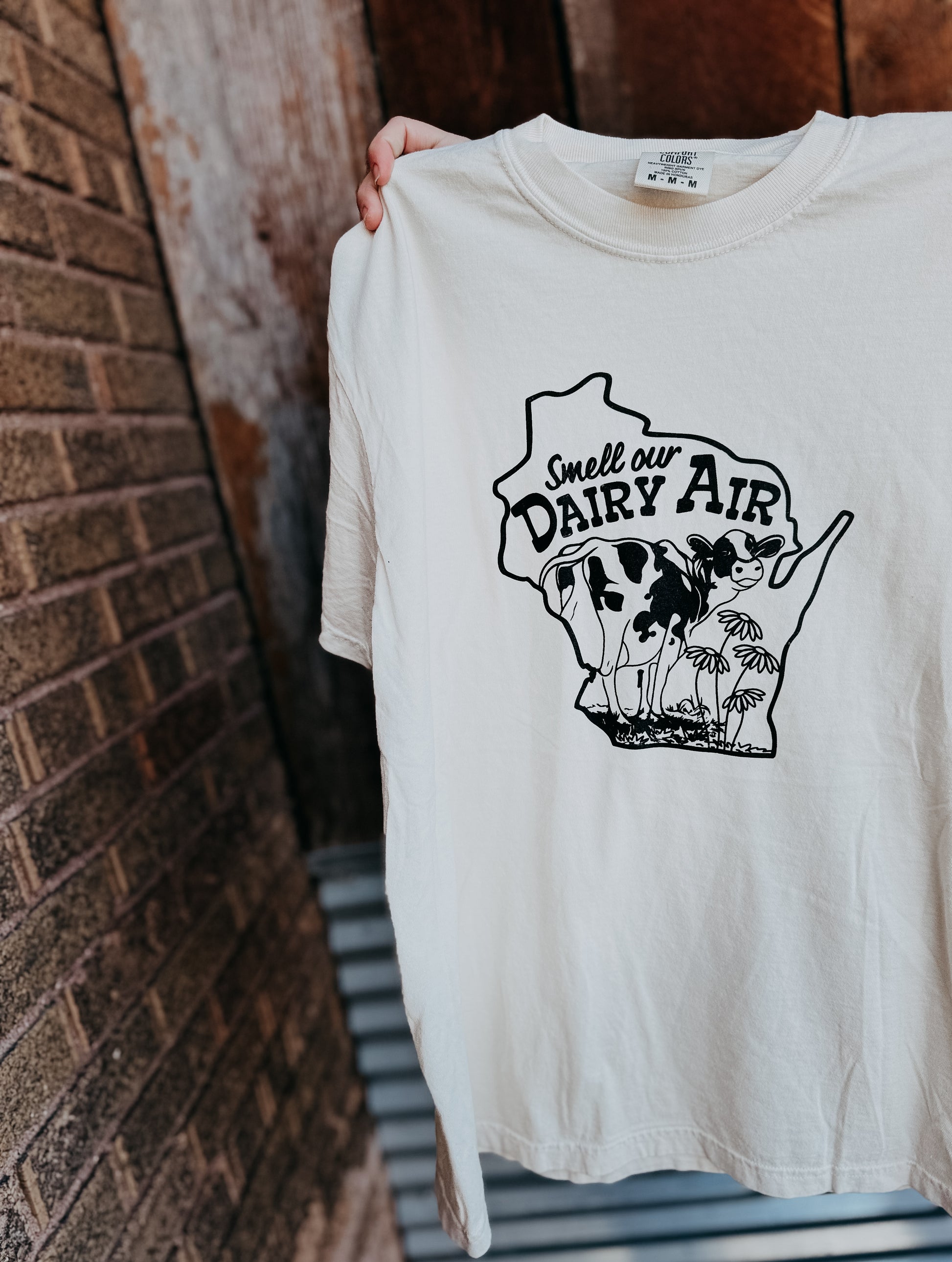 Soft, worn-in cotton and a hand-drawn Midwest postcard — this tee carries the slow, honest rhythm of country mornings. The design frames a state silhouette with a grazing cow and the playful line “Smell our Dairy Air,” giving the shirt a homespun, tongue-in-cheek charm. It drapes relaxed and substantial, so it’s the kind of shirt you reach for when you want comfort that still reads like you care about where you come from. Wear it to barn socials, Saturday chores, or backyard cookouts; it settles into the day and gets better with every wash.