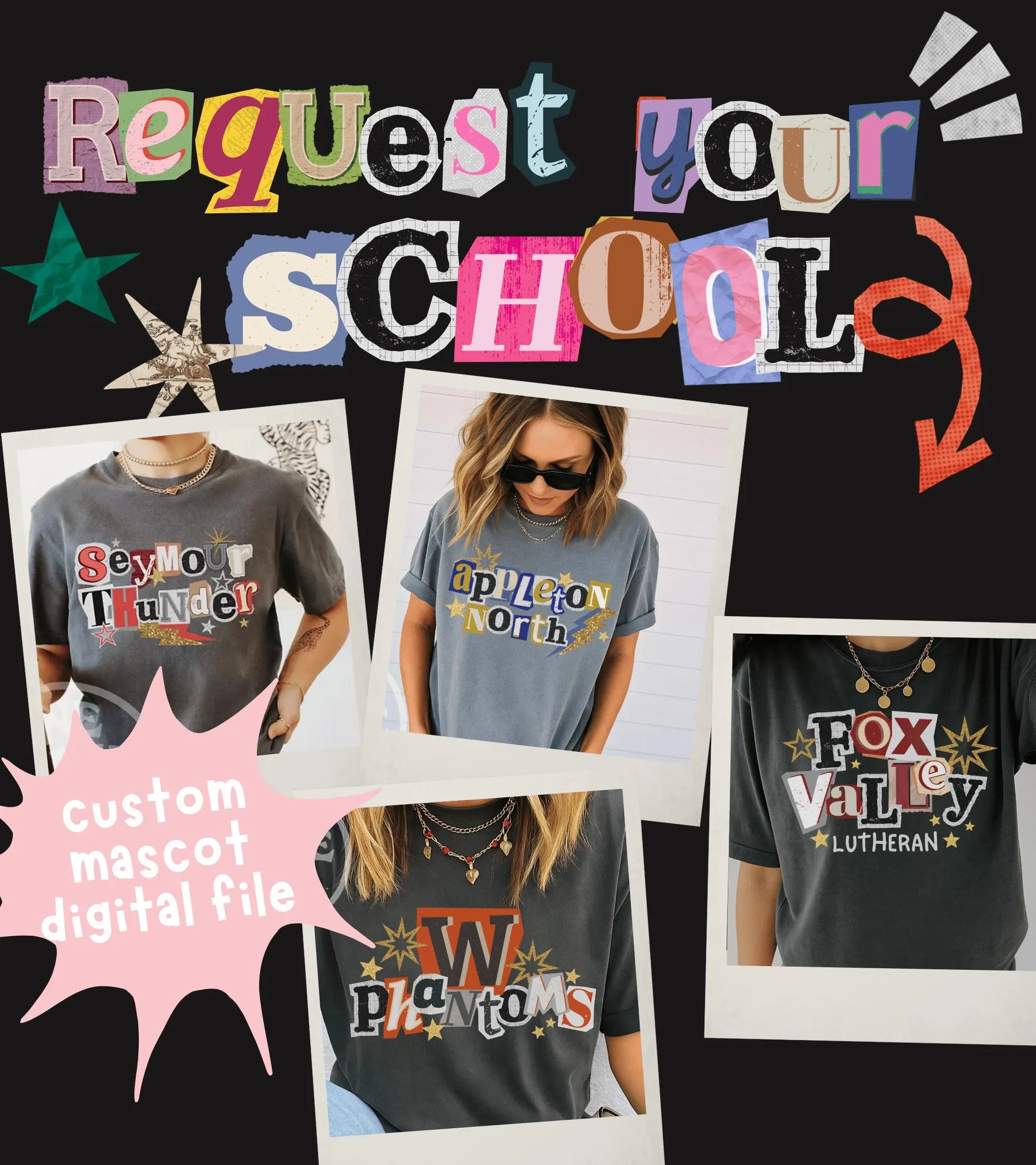 Show your school spirit with a one-of-a-kind design created just for your team! Whether it’s your high school, local club, or special mascot, we’ll bring your colors and name to life in our signature retro collage style. Perfect for t-shirts, sweatshirts, or spirit wear projects.