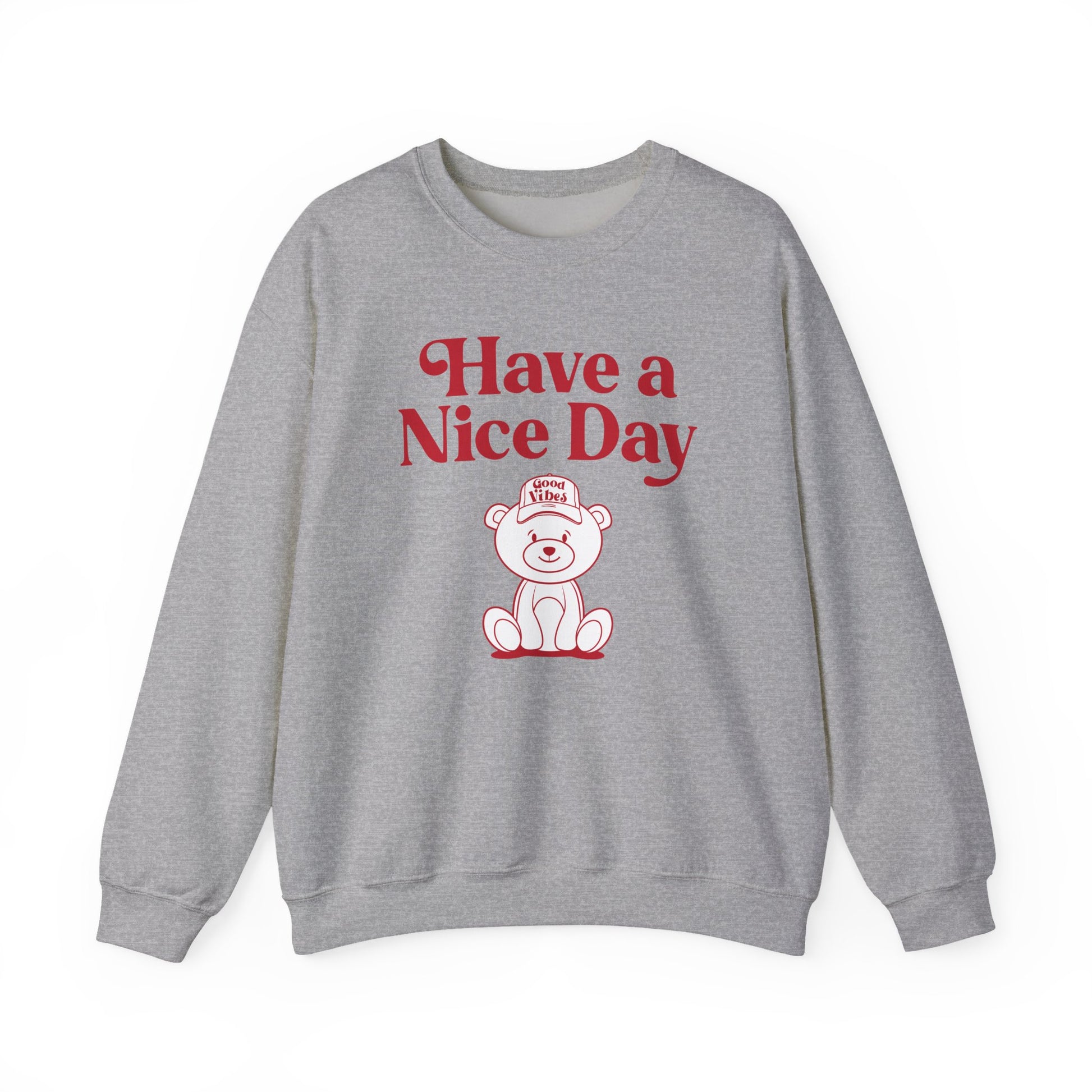 This medium-weight crewneck sweatshirt wraps you in a cozy, lived-in feel while keeping things playful and approachable. The centered artwork — a friendly teddy bear and the warm, retro script “Have a Nice Day” — sits like a little reminder you’ll actually want to wear. Soft heather texture, ribbed collar and cuffs, and a clean classic fit make it easy to layer over tees or lounge in on slow mornings. Built with durable double-needle stitching and responsibly sourced cotton, it’s a sweatshirt that looks casual but holds up to everyday life.