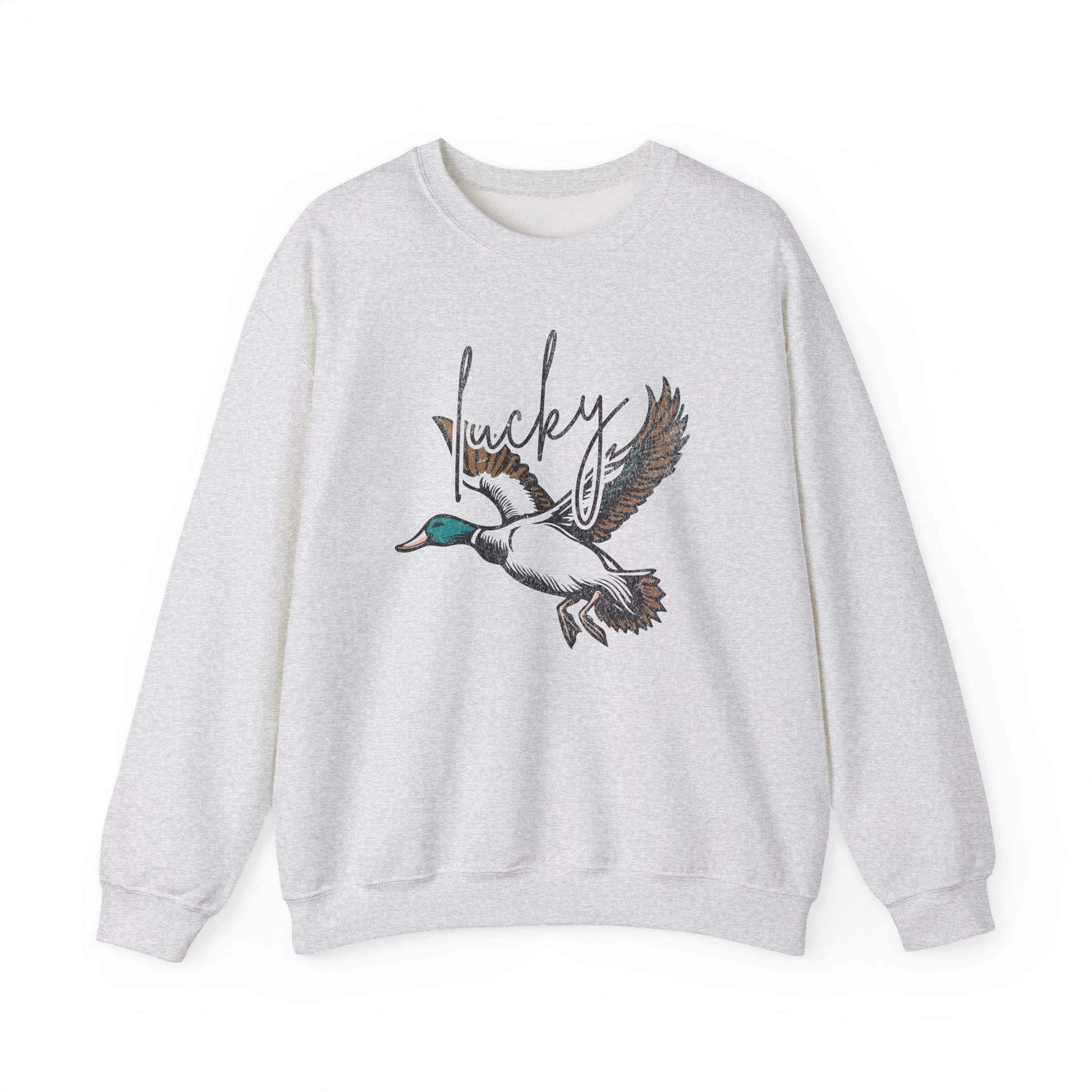 Lightweight yet cozy, this crewneck sweatshirt brings a breath of open air to quiet mornings. A hand-drawn mallard glides across the chest beneath a flowing, script “lucky,” the artwork printed with soft, slightly faded tones for a lived-in feel. Wear it on cool dawn walks, at the lakeside blind, or around a smoky campfire; it layers easily under a jacket and moves with you. The tubular knit construction and ribbed collar keep the silhouette clean while the 50/50 cotton-poly blend gives warmth without weight. Subtle details — tear-away neck label, durable double-needle stitching, and options for small embroidered accents at the chest or wrists — make it feel personal and made to last.