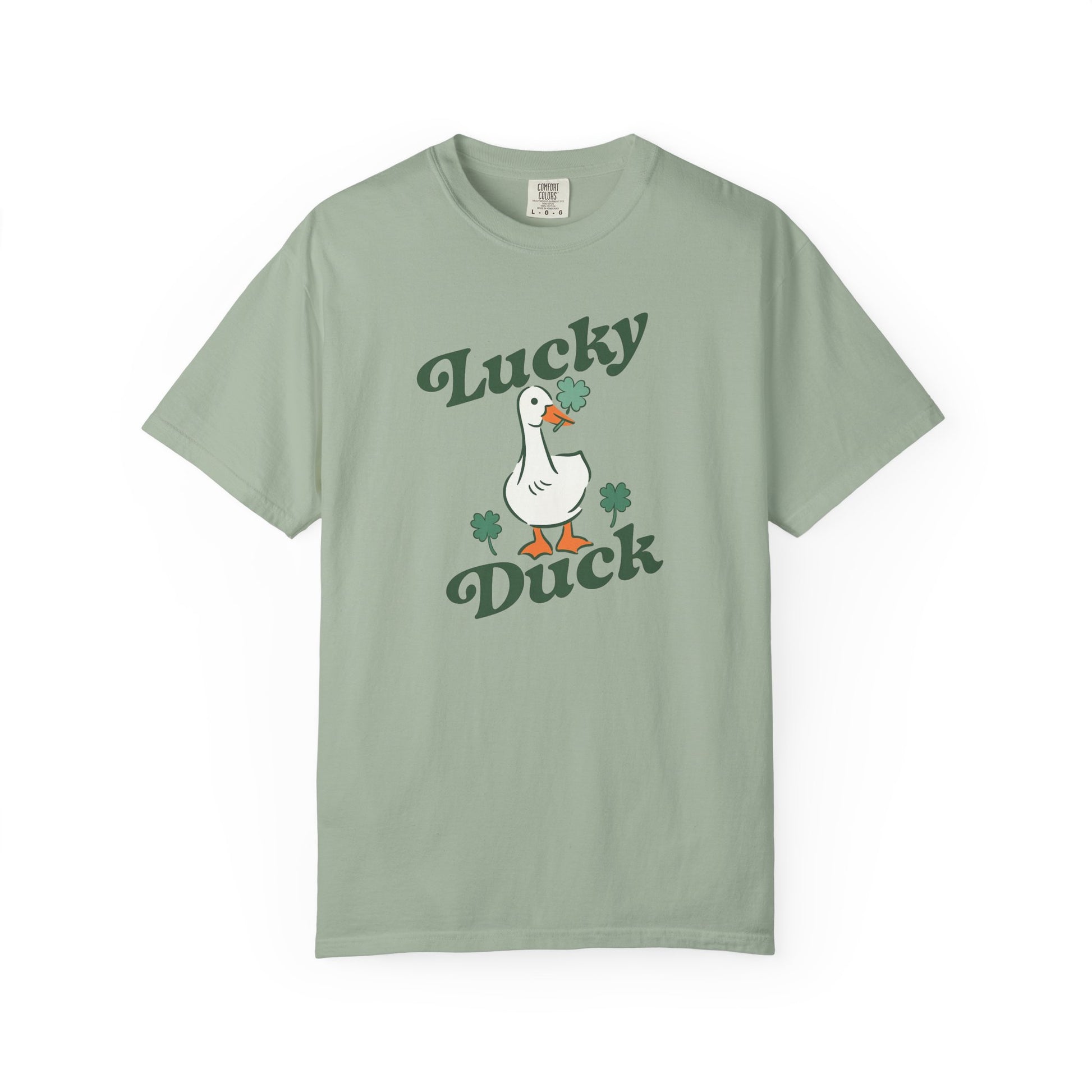 Meet a soft, garment-dyed tee that wears in like an old favorite. The Lucky Duck design—whimsical hand-drawn duck with tiny shamrocks and vintage-inspired lettering—lands centered on a relaxed, heavyweight cotton body. The dye-after-construction finish gives the shirt a lived-in texture and muted tone, while the roomy cut and durable double-needle seams stand up to repeated wear. This is the kind of shirt you reach for when you want something playful and low-effort: pair it with worn denim for weekend errands, layer under a flannel for a casual night out, or toss on for a relaxed St. Patrick’s Day get-together. The sewn-in label and tubular knit keep the silhouette clean, and with many colors and sizes available, it’s easy to find the finish and fit that match your style.