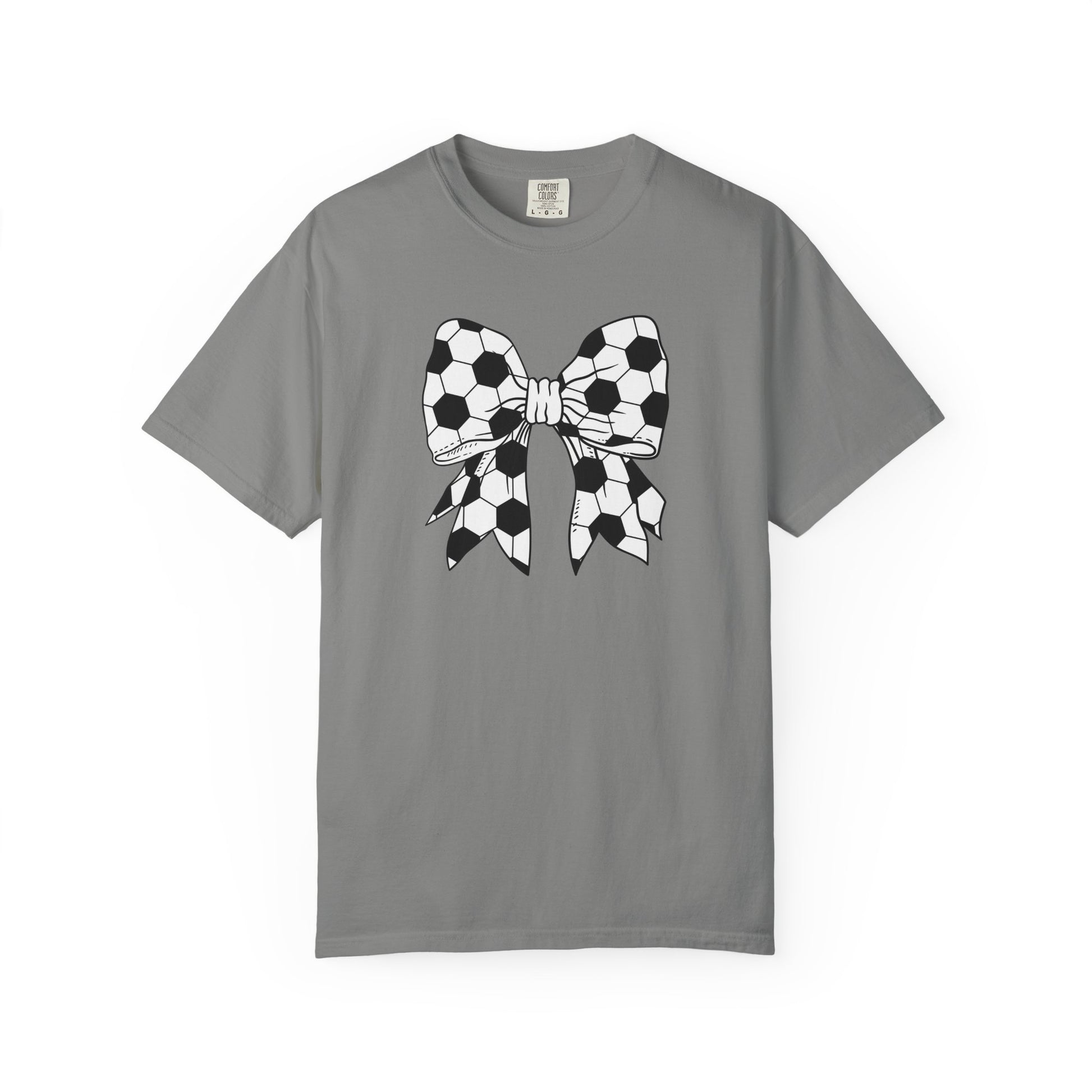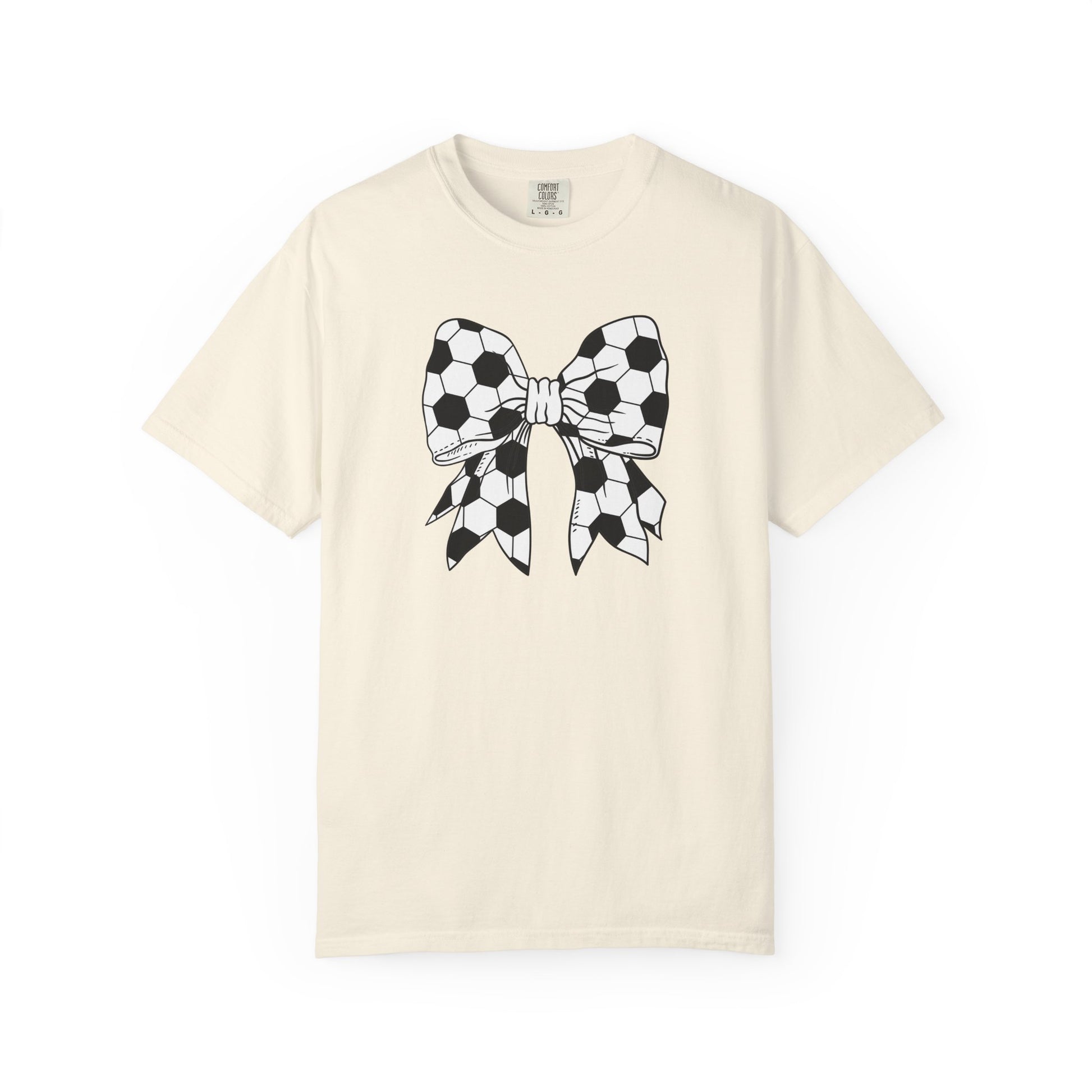 Soft, worn-in cotton with a distinctive graphic: a hand-drawn bow patterned in black-and-white soccer panels. This relaxed, heavyweight tee settles into the shoulders and breathes with each wear, carrying a nostalgic, sporty edge. The garment-dyed finish gives the fabric a lived-in, muted tone that complements the bold, sketch-like bow — a statement that reads playful and personal rather than flashy. Wear it to weekend practices, casual match days, or when you want a subtle nod to the pitch while running errands. The roomy cut layers easily over long sleeves or stands alone on warmer afternoons, offering a comfortable, approachable look that feels like an old favorite from the first wear.