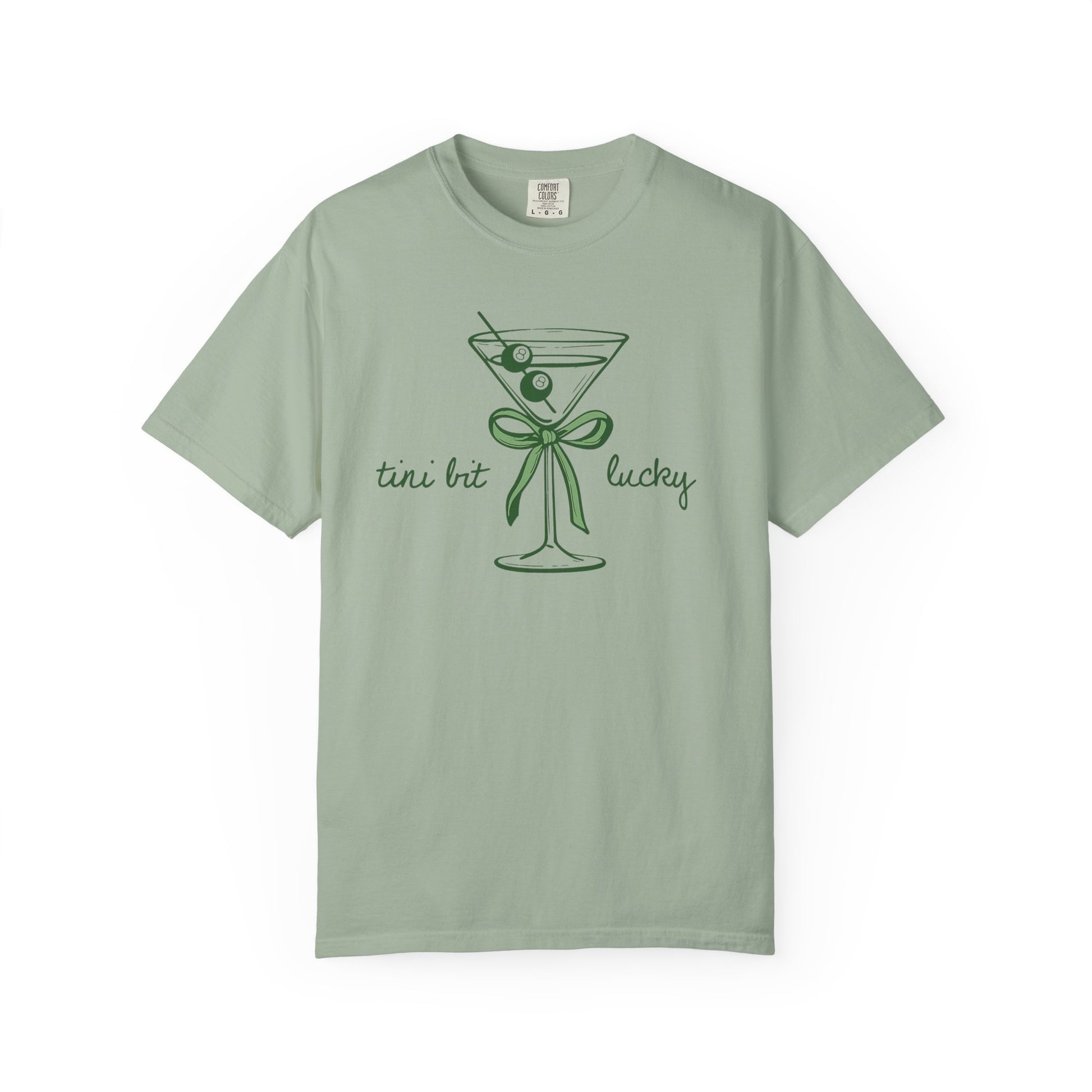 Soft, lived-in comfort with a wink. This garment-dyed tee brings a subtle vintage vibe to evenings out or laid-back celebrations. The front illustration — a simple martini glass tied with a green bow and flanked by the playful hand-lettered phrase — reads like a cheerful toast. The heavyweight cotton and relaxed cut drape easily over jeans or a skirt, and the faded, garment-dyed finish breaks in beautifully with wear. Wear it to casual cocktail nights, St. Patrick’s gatherings, or relaxed brunches when you want something that feels familiar and quietly festive.
