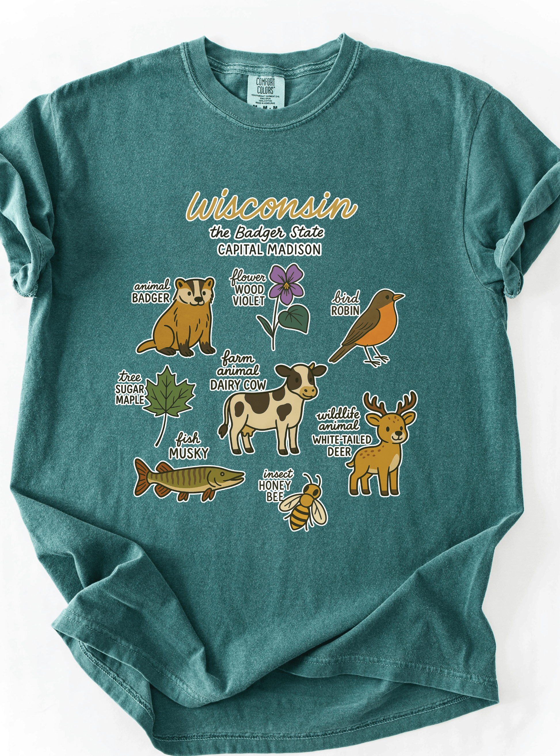 Soft, lived-in tee that feels like home in the first wear. This garment-dyed cotton shirt carries a quietly vintage palette and a relaxed cut—built to be worn through long walks by the lake, farmer’s market runs, and slow weekend mornings. The whimsical Wisconsin-themed illustration brings local flora and fauna into the fold: foxes, trout, a cow, and native blooms rendered in warm, hand-drawn colors. It layers easily under a flannel or stands on its own with jeans and boots. Breathable heavyweight cotton and thoughtful construction mean this shirt settles into your rotation and keeps its shape and color wash after wash. If you love small-town rhythms, outdoor afternoons, and designs with character, this tee fits right into that life.